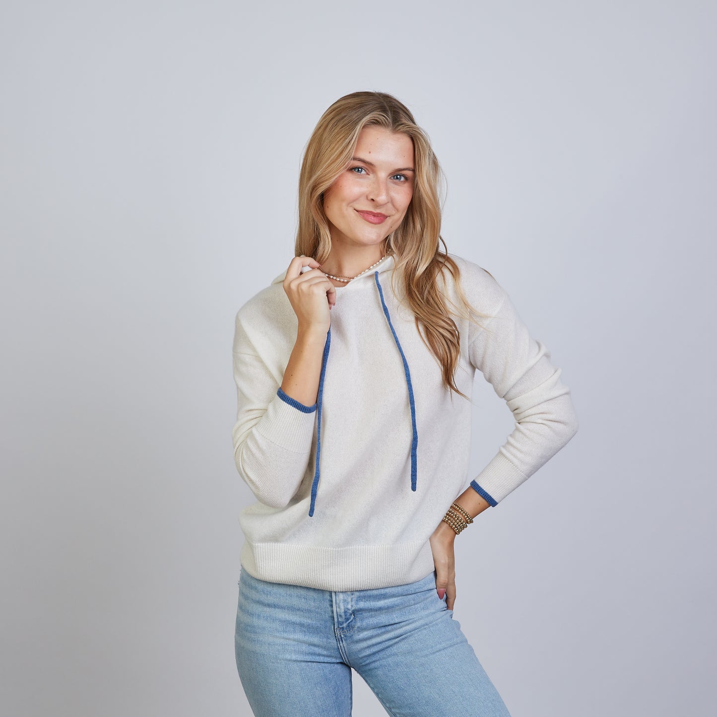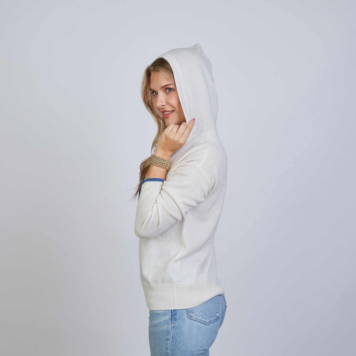Highland Hoodie 100% Mongolian Cashmere in Ivory with Blue