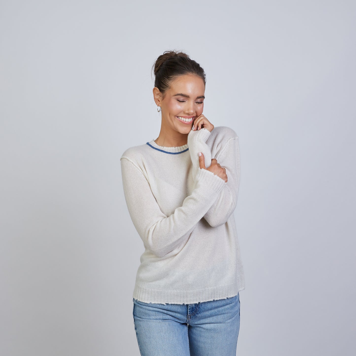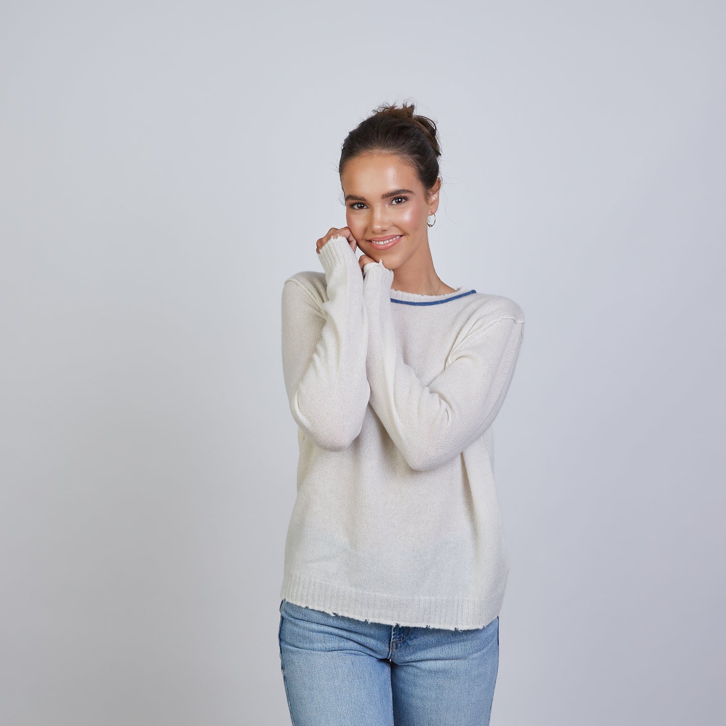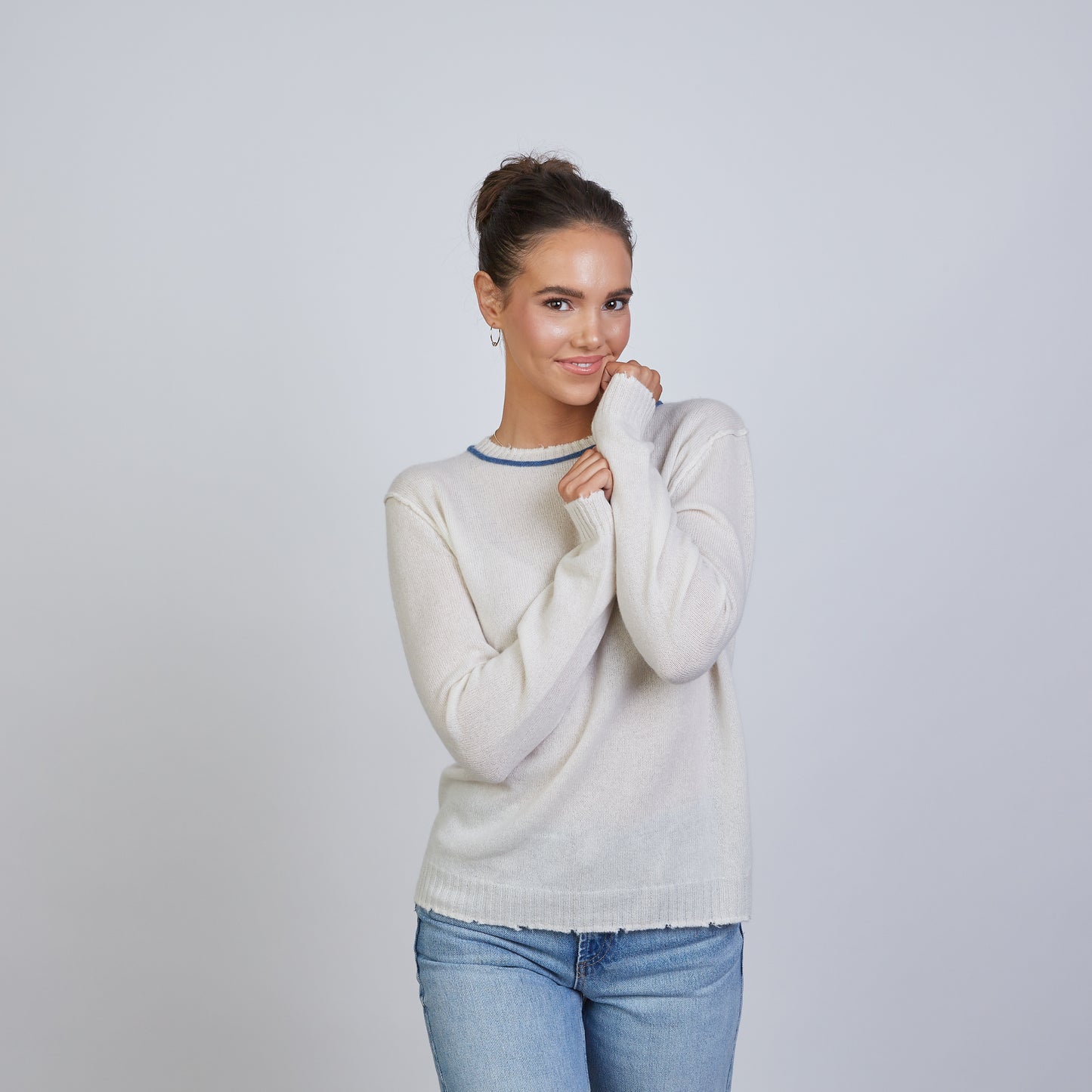 Highland Raw Edge 100% Mongolian Cashmere Sweater in Ivory with Blue