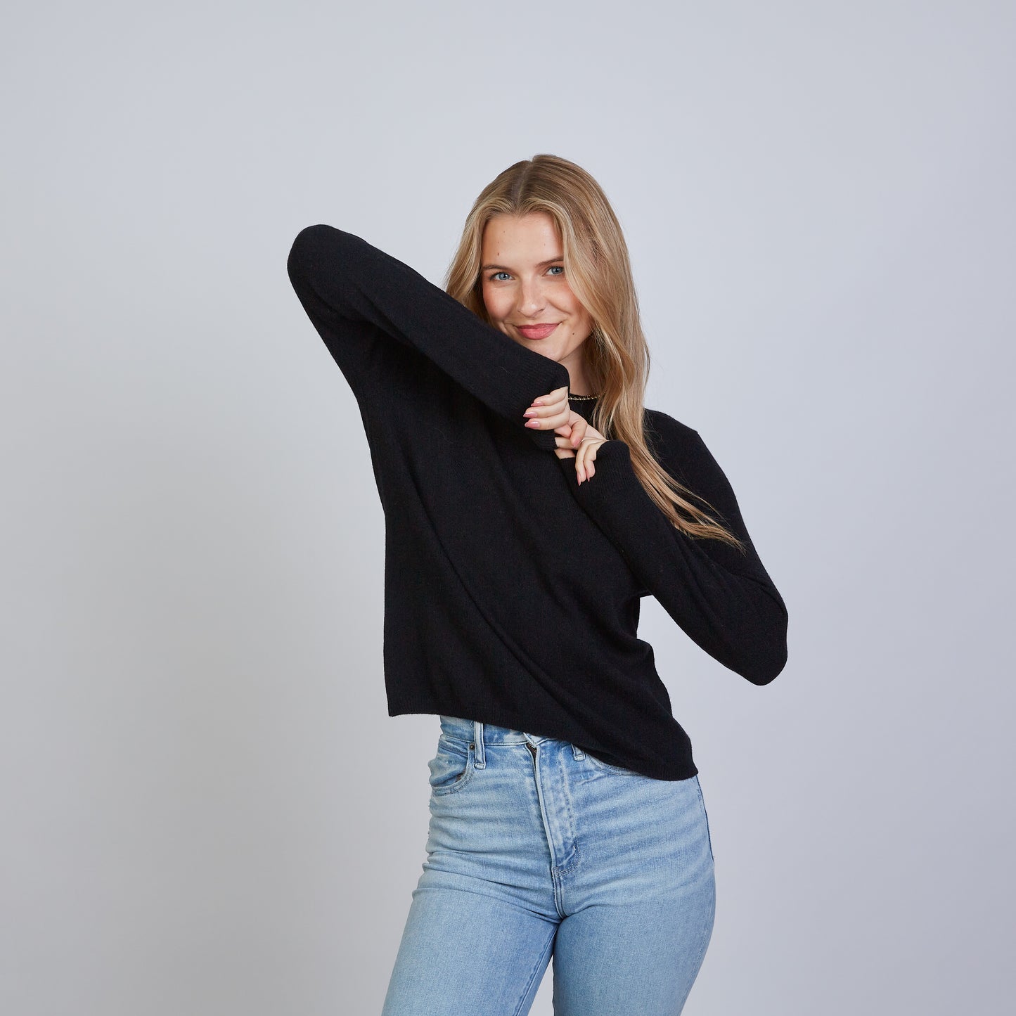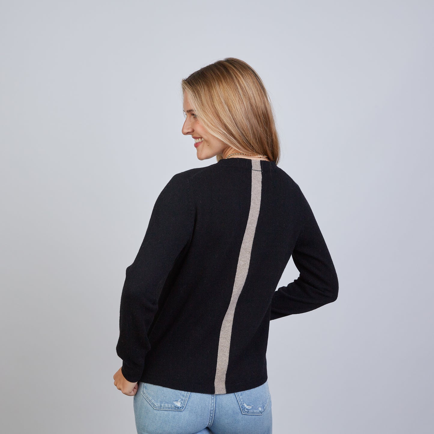 Minimal in front, bold in back. This 100% Mongolian cashmere sweater features a sleek crewneck with an unexpected vertical stripe running down the back. Crafted for effortless elegance, it's soft, lightweight, and versatile enough to pair with denim, trousers, or layer under an erin gray puffer vest. Everyday luxury with a modern edge.