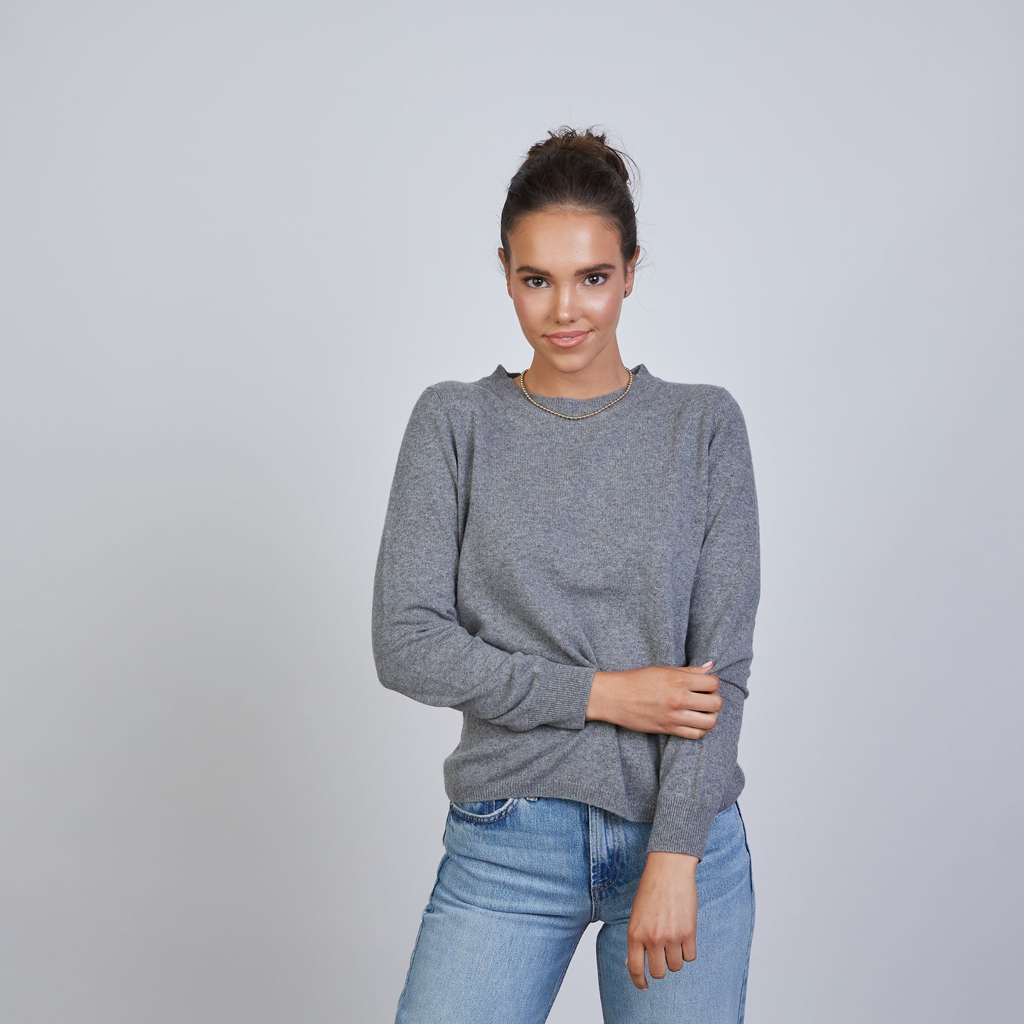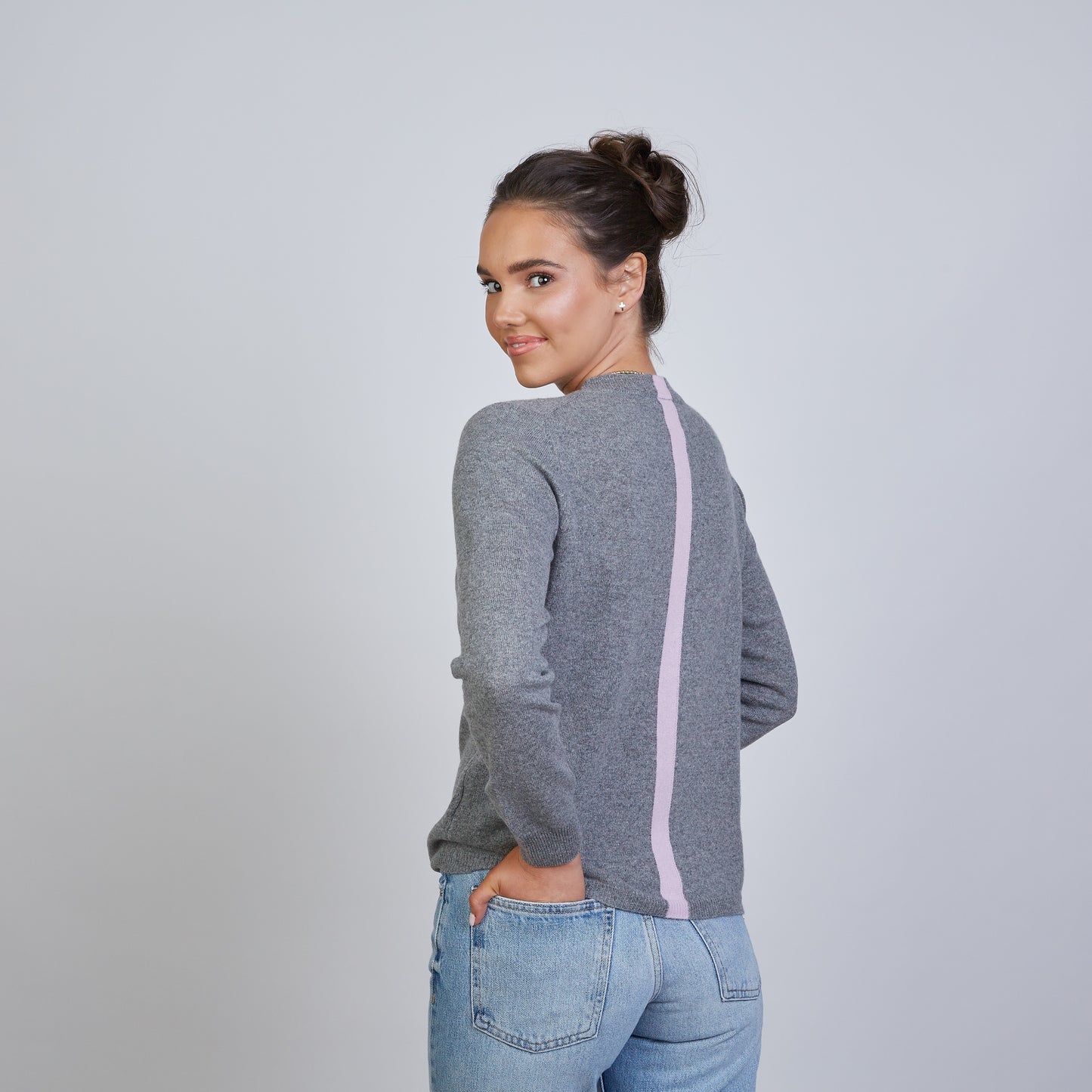 The Highland Stripe Sweater features a refined gray crewneck with a striking lilac stripe down the back. Crafted from 100% Mongolian cashmere, it's exceptionally soft and versatile—wear it with denim for casual ease or pair with tailored pieces for a polished look. Timeless design for all seasons.