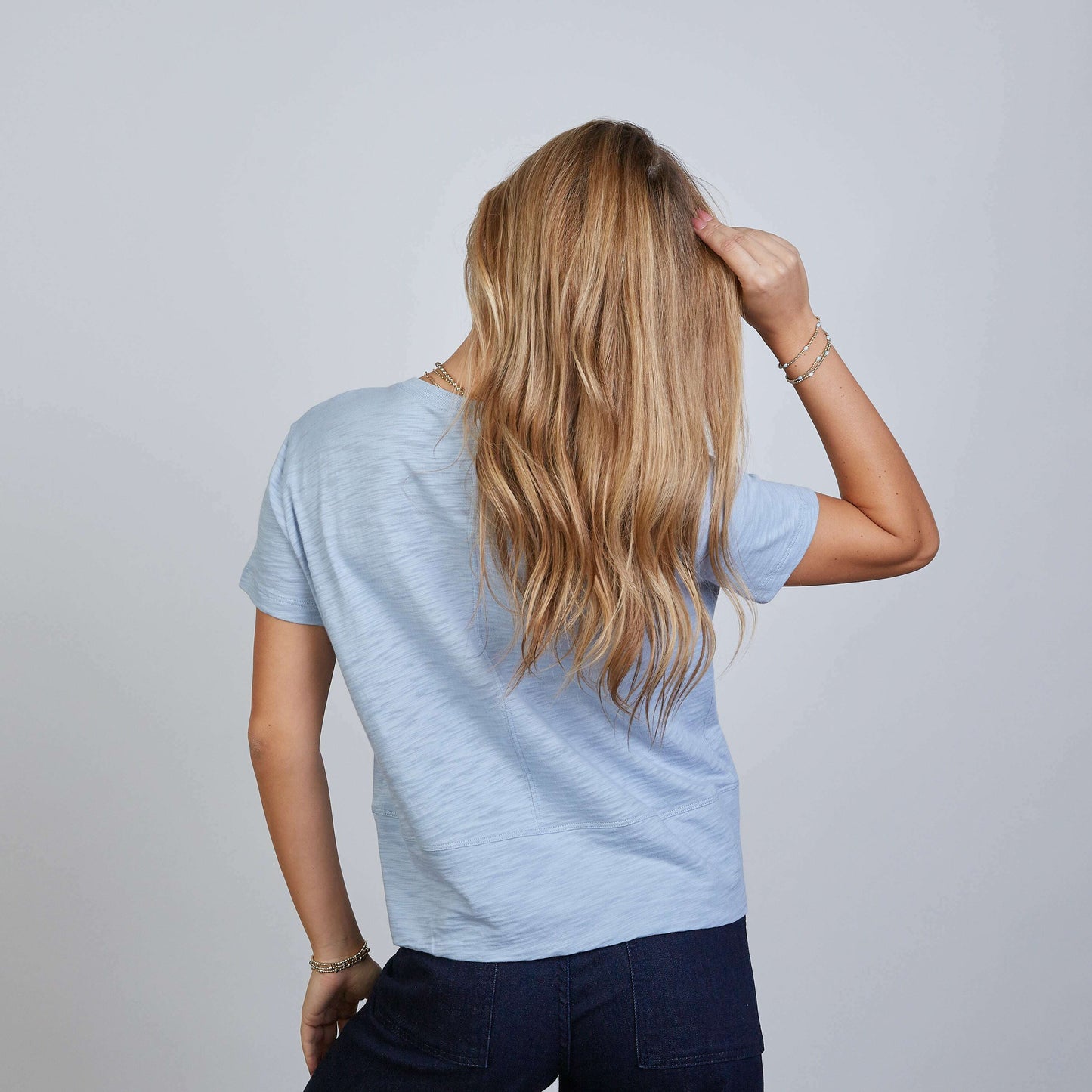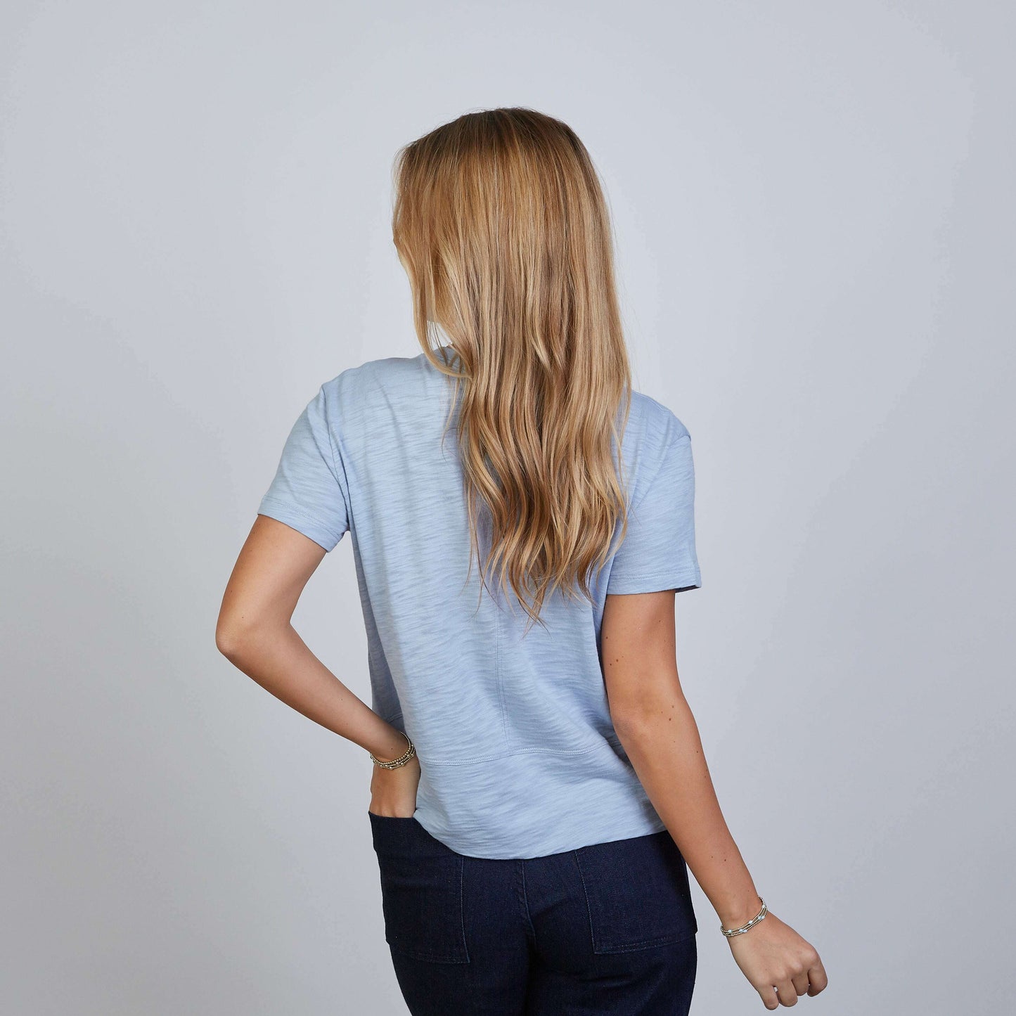Our Celia tee, a favorite that’s sold out 15 times, has the ideal length—just below the waistband—perfect for pairing with jeans. It includes double-layered, wider cuffs at the waist for a stylish, flirty detail. Made from 100% Pima Cotton Slub fabric, it’s soft, opaque, pre-shrunk, and tagless. Packaged in biodegradable bags and made in Peru.