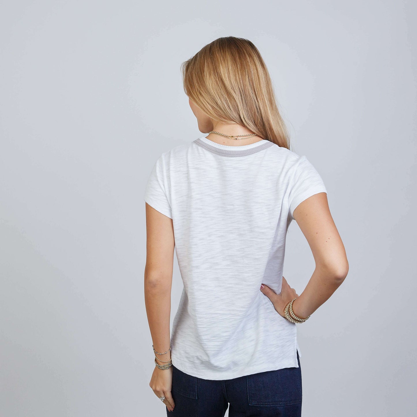 Ivy Tee in White with Dusty Lilac Neckline - Short Sleeve