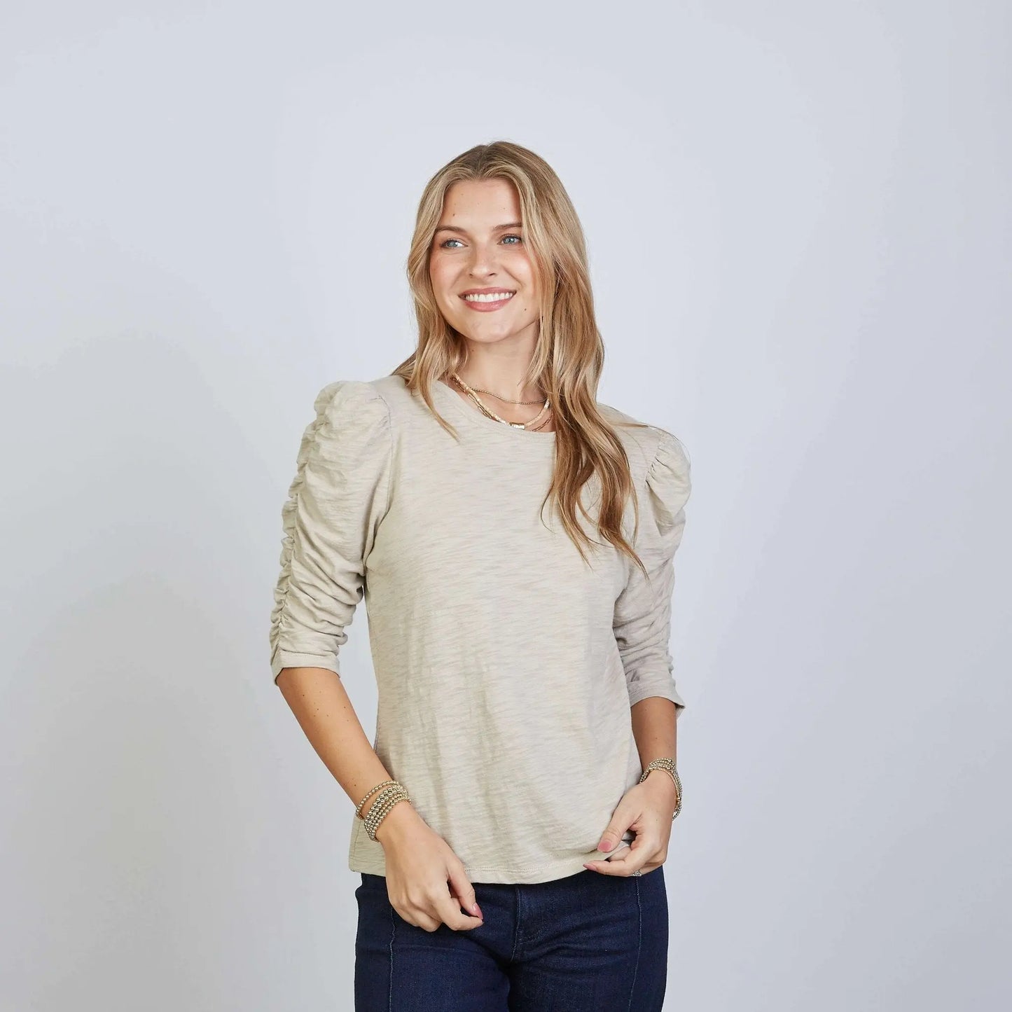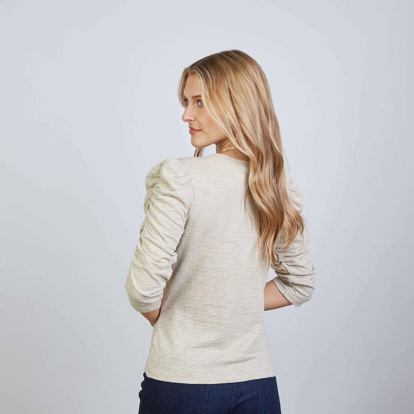 Our super soft and best-selling Sophie top features flirty elbow-length ruched sleeves in crewneck. Pairs perfectly with your favorite jeans for a simple and elevated look. Preshrunk, tagless and constructed of our soft 100% Pima Cotton. Packaged in biodegradable bags and made with love in Peru.