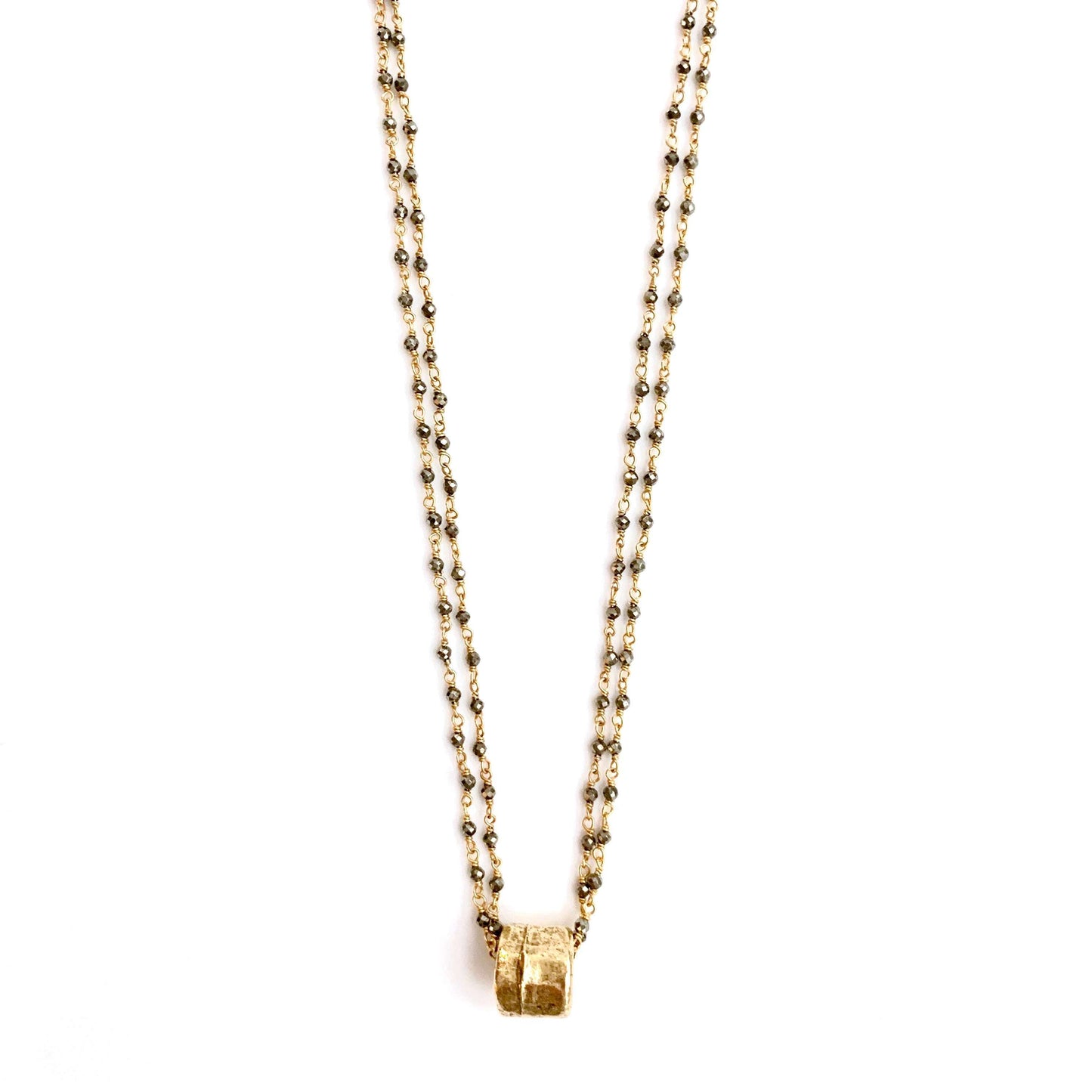 This elegant necklace features a brushed gold barrel pendant on two strands of shiny pyrite beads. Adjustable from 16 to 18 inches, it fits comfortably and adds a subtle glow to any look. Part of the erin gray barrel collection, it’s sure to become a favorite.