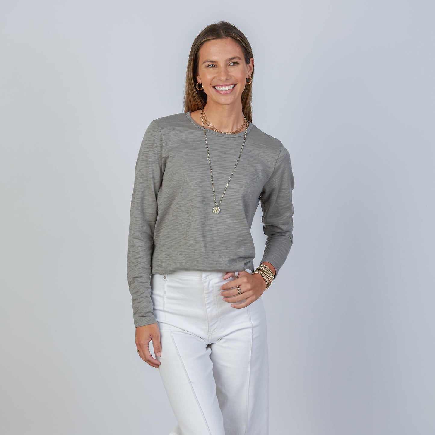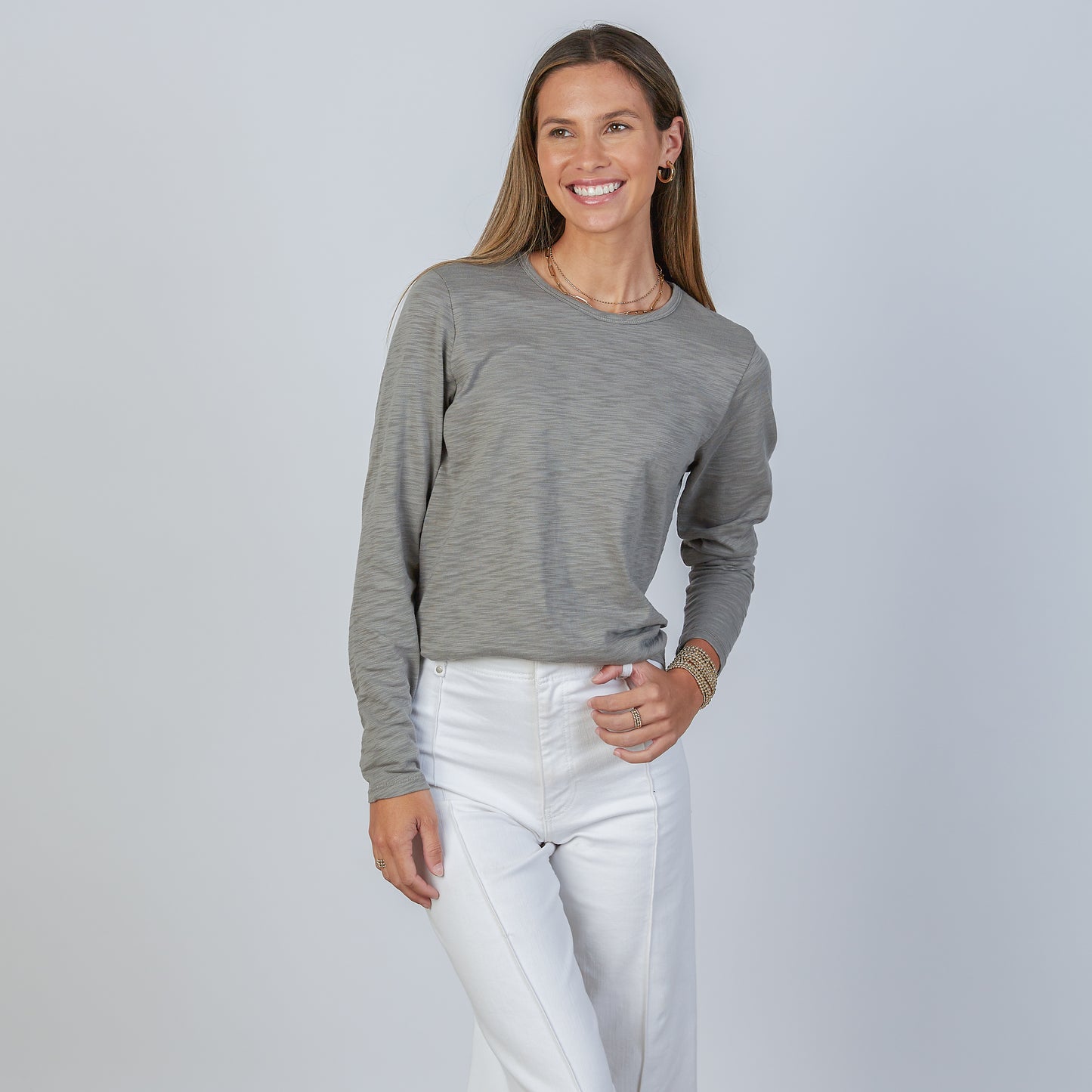 This Classic long sleeve tee is made from soft, 100% Pima cotton slub fabric. It features a flattering length, is not see-through, pre-shrunk, and tagless. Perfect for any occasion, especially with jeans. Packaged in biodegradable bags and made in Peru.