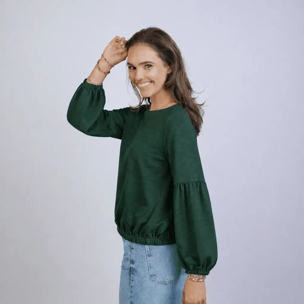 This feminine long-sleeve shirt is made from 100% pima cotton, offering a soft, breathable feel with a polished finish. Stylish balloon sleeves with delicate contrast stitching add a refined touch, creating a flattering, elevated tee that transitions effortlessly from day to night. Packaged in biodegradable bags and made with love in Peru.